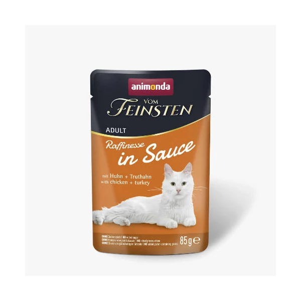 A Vom Feinsten Raffinesse csirke-kacsa szószos változatát - tökéletes választás igényes macskák számára, akik csak a legjobbat érdemlik. A finom szószban elfogyasztott omlós húsdarabok élvezetet nyújtanak, és mindent biztosítanak, amire macskájának nap mint nap szüksége van: