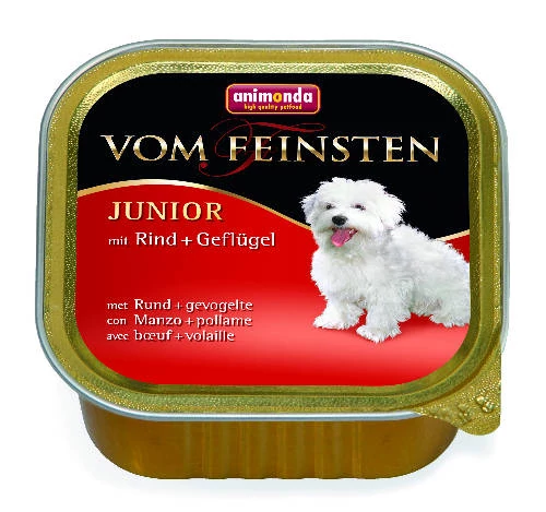 Az Animonda Vom Feinsten Junior illeszkedik a kölykök és fiatal kutyusok táplálkozási igényeihez. Az összetétel tiszta, húsos alapanyagokból áll, gabona, szója, cukor, valamint mesterséges tartósítószerek és színezékek nélkül. Három fajtából álló választék.