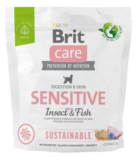 Brit Care Dog Sustainable Digestion & Skin Insect & Fish — Teljes értékű, hipoallergén, gabonamentes, Fenntartható alapanyagokból készült, rovarfehérjében és halhúsban gazdag szuperprémium táp minden érzékeny, igényes bőrű és szőrzetű kutyafajta felnőtt egyedei számára. rovarokban és halhúsban gazdag gabonamentes recept intoleranciában szenvedő érzékeny kutyák számára.