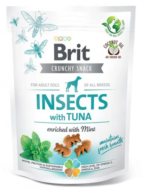A Brit Care Crunchy Cracker Insects with, Mentával dúsított tonhal egy kiegészítő kutyacsemege, amely megőrzi a friss leheletet.