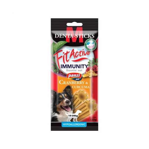 A FitActive Denta-Sticks Cranberry & Curcuma nemcsak segíthet a fogkő kialakulásának megelőzésében, hanem vitaminos és gyógynövényes összetétele révén támogathatja a kutyák immunrendszerének egészségét is.