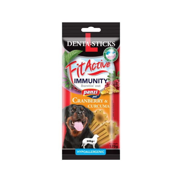 A FitActive Denta-Sticks Cranberry & Curcuma nemcsak segíthet a fogkő kialakulásának megelőzésében, hanem vitaminos és gyógynövényes összetétele révén támogathatja a kutyák immunrendszerének egészségét is.