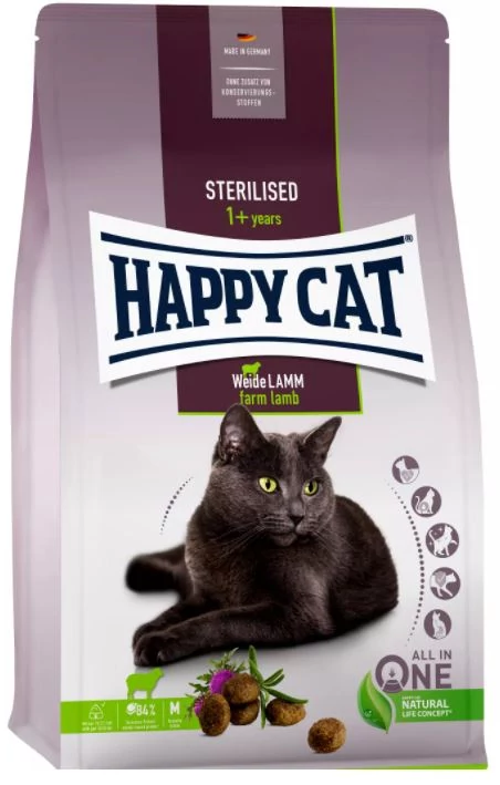 A Happy Cat Sterilised Weide-Lamm (bárány) kifejezetten az érzékeny, felnőtt macskák számára lett kifejlesztve, akiknek ivartalanítás után kiváló, tápláló eledelre van szükségük.