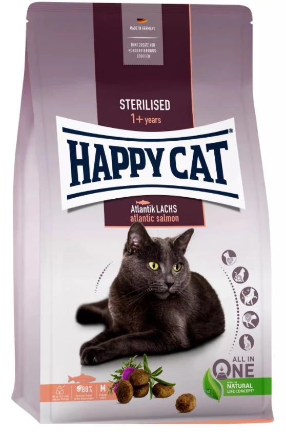 A Happy Cat Sterilised Atlantik-Lachs (atlanti-óceáni lazac) kifejezetten az érzékeny, felnőtt macskák számára lett kifejlesztve, akiknek ivartalanítás után kiváló, tápláló eledelre van szükségük.