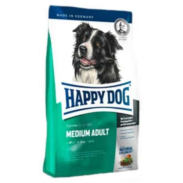 A Happy Dog Medium Adult 5 kiváló minőségű, könnyen emészthető fehérje-összetevőt és ezzel arányosan 12% zsírt tartalmaz minőségi állati és növényi forrásokból származó létfontosságú telítetlen omega-3 és omega-6 zsírsavakkal.