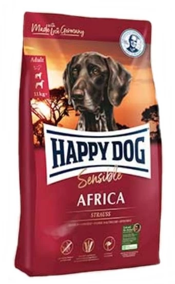 A Happy Dog Supreme Sensible Africa egy teljes értékű eledel minden 10 kg feletti, normál energiaszükségletű, felnőtt kutya számára. Kiválóan alkalmas a közepes- és nagytestű fajtákhoz tartozó, érzékeny táplálkozású, speciális igényű kutyáknál is.