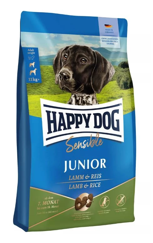 A Happy Dog Sensible Junior Lamm & Reis egy teljesértékű eledel normál energiaszükségletű közepes- és nagytestű fiatal kutyák számára 7 hónapos kortól 18 hónapos korig.