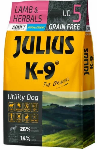 A JULIUS-K9® Utility Dog Lamb & Herbals a bárányhús mellett marhahúsból és lazachúsból készült, mindhárom állati fehérje hipoallergén húsforrás, amely alkalmas a csirke allergiás kutyák etetésére. A bárány és a marha is tartalmaz esszenciális aminosavakat, vitaminokat és ásványi anyagokat, amelyek támogatják az izomfejlesztést és fenntartják az energiát. Egy további gyógynövény koktél segít az ízületi gyulladás elkerülését, valamint az immunrendszer támogatását. A magas rosttartalom biztosítja a kutyák emésztőrendszerének fittségét.