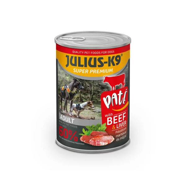 A JULIUS-K9 Beef & Liver prémium konzerv szaftos húsdarabokat kínál ízletes mártásban, természetes összetevőkkel.