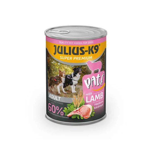 A JULIUS-K9 Lamb prémium konzerv szaftos húsdarabokat kínál ízletes mártásban, természetes összetevőkkel.