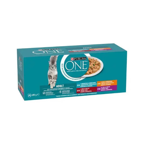 Purina One Adult, csirkével/marhával/tengeri hallal szószban nedves macskaeledel 40x85g