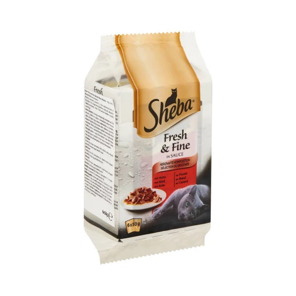 A Sheba Fresh & Fine Húsos Válogatás Mini egy teljes értékű eledel felnőtt macskák számára.