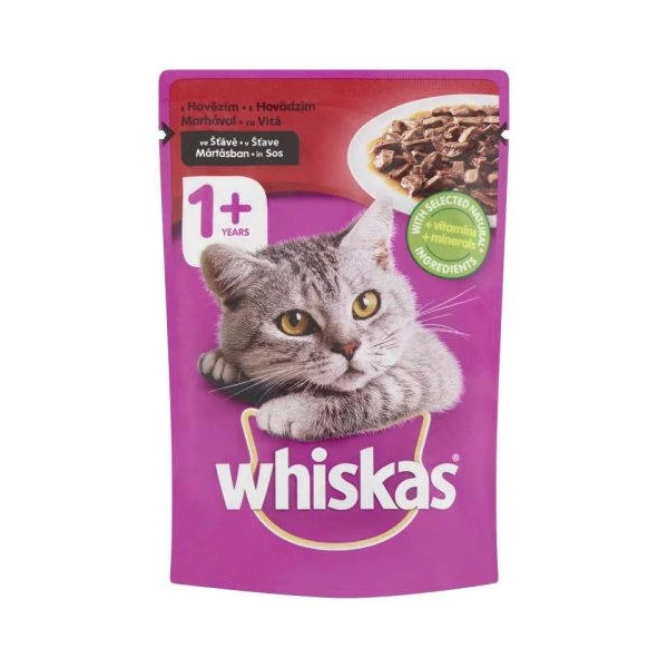Whiskas Adult Beef 1+ - Nedves eledel (marha-, szószban) macskák részére (85g) 28db/#