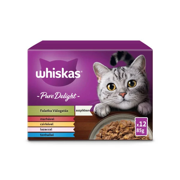 Whiskas Pure Delight Adult – Nedves eledel (marha,csirke,lazac,tonhal aszpikban) macskák részére (12x85g)